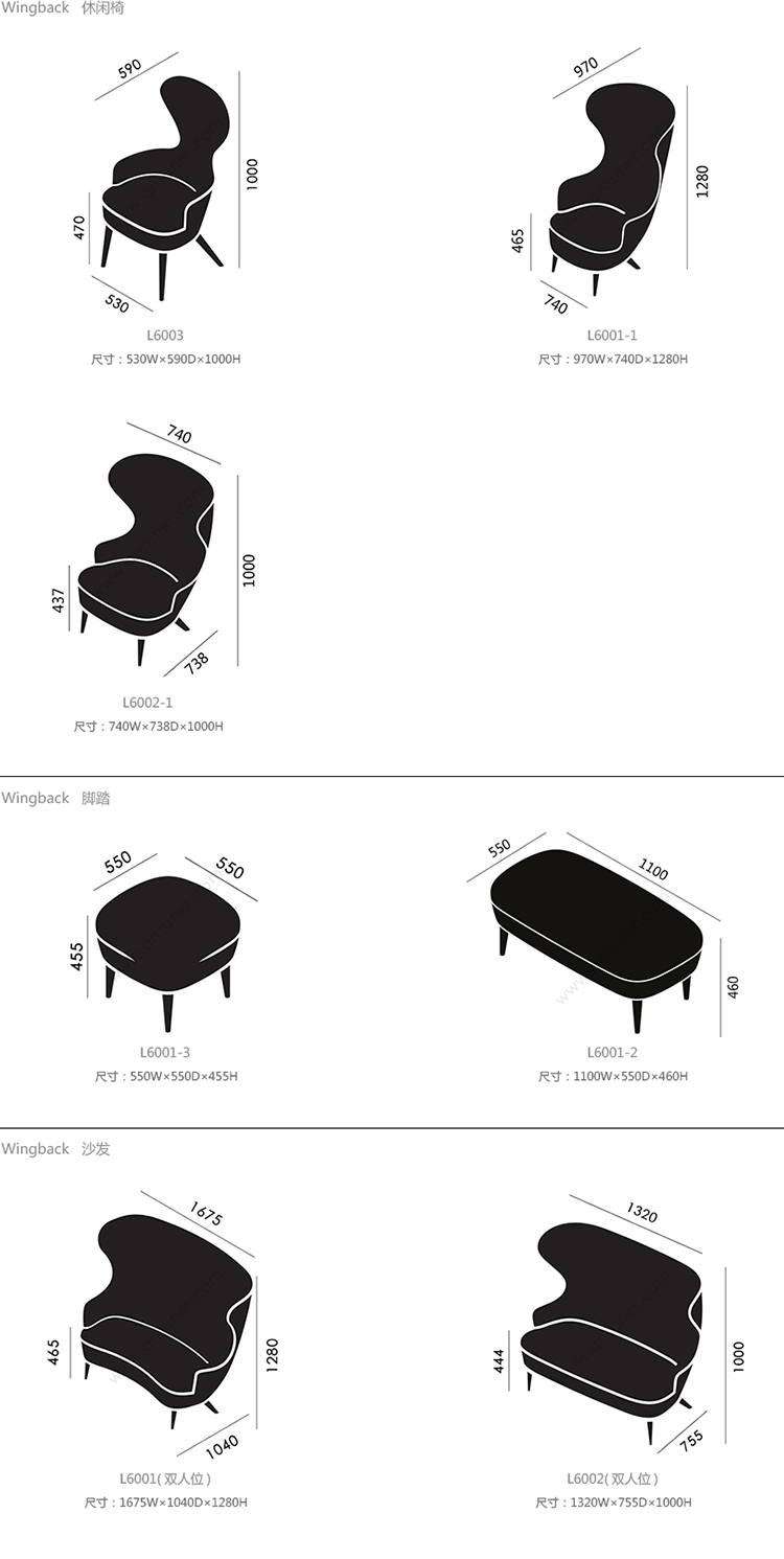 Wingback 休闲椅 系列尺寸/示意图