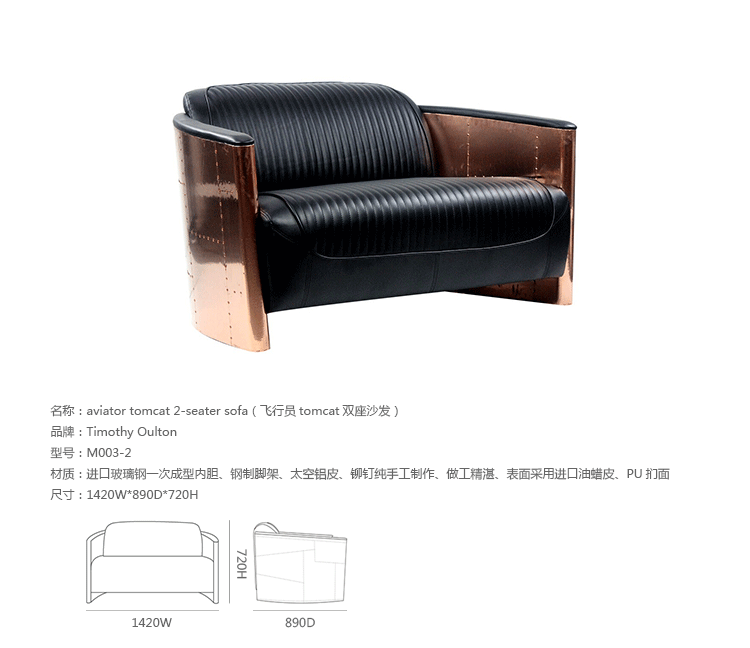 Tomcat系列家具由英国著名设计师Timothy Oulton设计,该系列包括Aviator Tomcat Chair(飞行员Tomcat椅)、Aviator Tomcat 2-seater Sofa(飞行员Tomcat双座沙发)、Aviator Tomcat 3-seater Sofa(飞行员Tomcat三座沙发)。Tomcat系列曾屡获殊荣,灵感来自F-14雄猫式战斗机。 椅子的靠手用铆接铝板制造,弧形线条符合空气动力学,有如一双机翼,座垫和靠背则使用柔软仿古皮革制造,好像飞行员夹克。