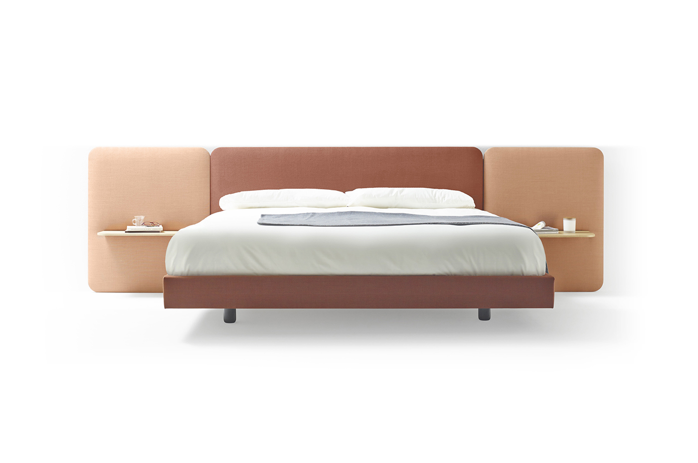 不同宽度和高度的圆形嵌板,不同颜色的织物组合,浮动的书架和有抽屉的床头柜:用Lota系列为你的卧室增添你的个人风格。