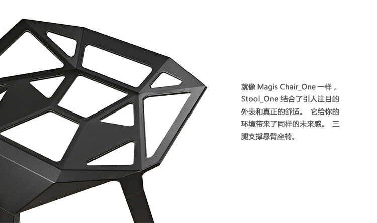 Stool One(几何吧凳/变形金刚吧凳)是德国设计师Konstantin Grcic(康士坦丁·葛切奇)的设计作品。 Stool One(几何吧凳/变形金刚吧凳),镂空钻石的坐面设计,棱角的触感更时尚大气,视觉上的冲击,艺术的价值,无论搭配什么样的环境,都是显得那么融入,那么个性。是现代风格酒吧、家庭吧椅理想的选择,坐感舒适,用材讲究,超现代风格,是一把艺术性与实用性相结合的经典。