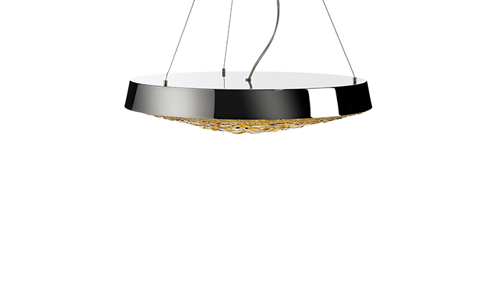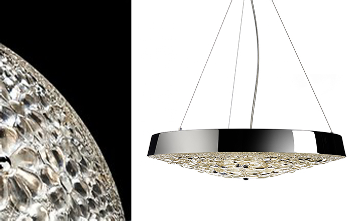 "A magic mirror and the power of crystals transform a simple shell into an endless light bouquet of flowers', Marcel Wanders material crystal clear glass with chromed, gold plated shade, transparent cord and 3 steel cables additional Integrated LED lightsource"