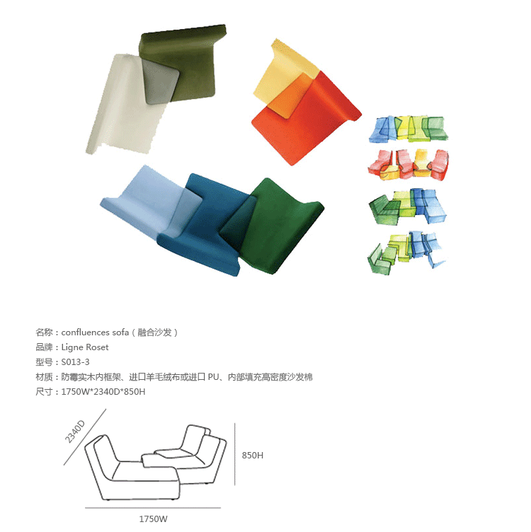 法国写意空间公司(Ligne Roset)在今年的科隆国际家具展上展出了这一款Confluence模块沙发,并获得了最佳设计奖(Best of Best)、最佳项目奖(Best Item)及最佳系列奖(Best System)三个奖项。Confluence模块沙发由法国设计师Philippe Nigro设计,这款沙发非常规的外型构造突显了设计师非凡的想象力和创造力,其相互交汇的构造看上去就像拼图一样充满趣味,而这种造型无疑也会给其陈设空间带来一种新鲜感。Confluence模块沙发可让使用者随其心意而将不同颜色、不同形状的模块搭配成各种组合,这也使其为体型不同,审美有异的各类人群都提供了个性化的就坐方式。设计师的创作灵感来自于现代美术作品中重叠的图形和笔直的线条,而略去了传统家具设计经常遵循的对称原则。Confluence模块沙发由多层木板和焊接钢片作为框架,内部由各种密度的聚醚泡沫材料填充,其表面面料为聚酯纤维织物,沙发脚由黑色聚丙烯制成。Confluence模块沙发各部分间相互重叠与镶嵌的方式令人眼前一亮,实用而有趣,满足了外型的美观而又充分体现了强大的功能,这应该是每件家具都追求的目标吧。