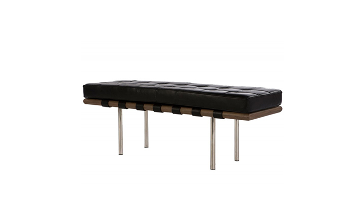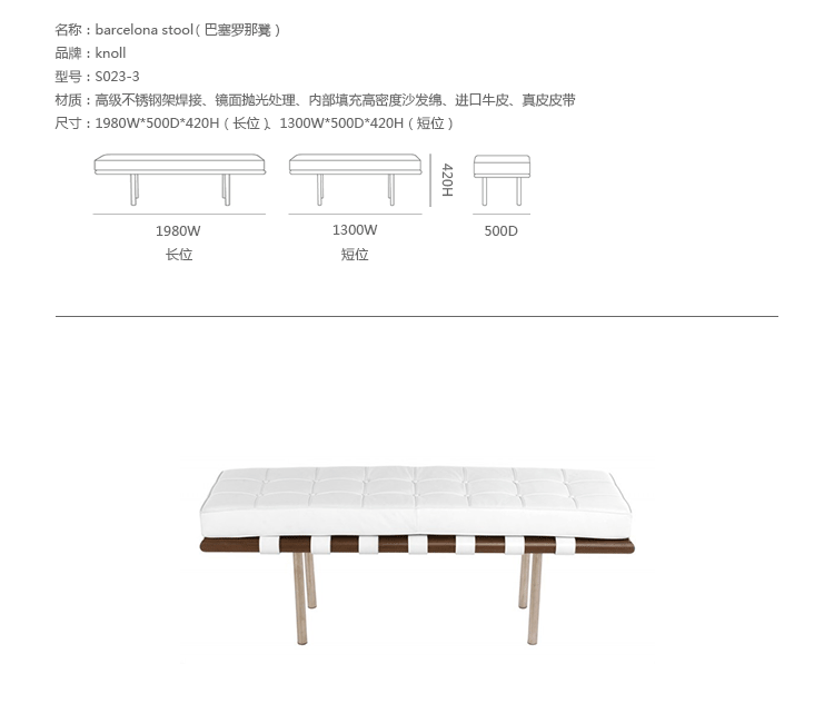 barcelona stool(巴塞罗那凳)是美国设计师Harry Bertoia设计的,像她其他突破性的工业设计一样,barcelona stool(巴塞罗那凳)表现了20世纪中期的现代设计和体系结构。人们能从这款长凳子的设计中领略到设计师“少即是多”的建筑理念。它将眩亮的不锈钢、柔软的皮革以及原木完美地结合在一起,具有很强的现代感。不管是居家还是办公场所,巴塞罗那长凳都能放置其中,成为很好的摆设;无论是小坐片刻还是午间休憩,都是理想之选。