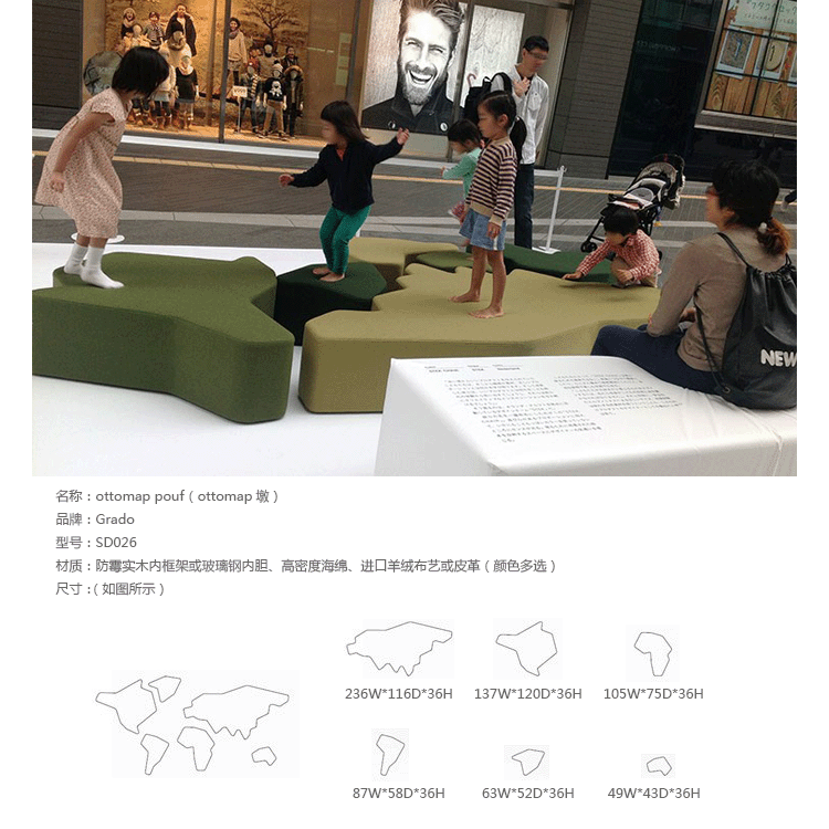 Vincenzo Vinci设计的Ottomap Pouf(ottomap墩),灵感来自五大洲大陆板块地图形式,让你有着坐在世界之上的感觉,是一个功能性和艺术性的有机结合。制作采用防霉实木内框架或玻璃钢内胆、高密度海绵、进口羊绒布艺或皮革(颜色多选),非常的舒适。