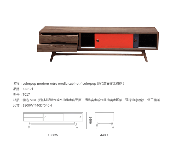 colorpop modern retro media cabinet(colorpop现代复古媒体橱柜)是Kardiel公司制作的经典实木家具。复古但永不过时的木炭是和橙色,结合美国核桃开创了20中世纪六十年代中现代主义的时代。在现代主义的存储家具上, Finn Juhl和 Arne Vodder 最先尝试胶木和天然木的组合运用。这是大胆的创新,他们结合传统的新鲜的新兴技术与现代主义的概念。他们通过这些色彩绚烂的产品所实现的是令人印象深刻的比例的平衡。流行的橙色和木炭色在现代主义风格上所达到的是受人尊的崇永恒。无论是直接挂在墙上,还是放在地面上,Color Pop就是能满足您理想的高度,并让电视机带着优雅的气质。制作采用精选MDF板基材胡桃木或水曲柳木皮贴面、胡桃实木或水曲柳实木脚架、环保油漆喷涂、做工精湛。