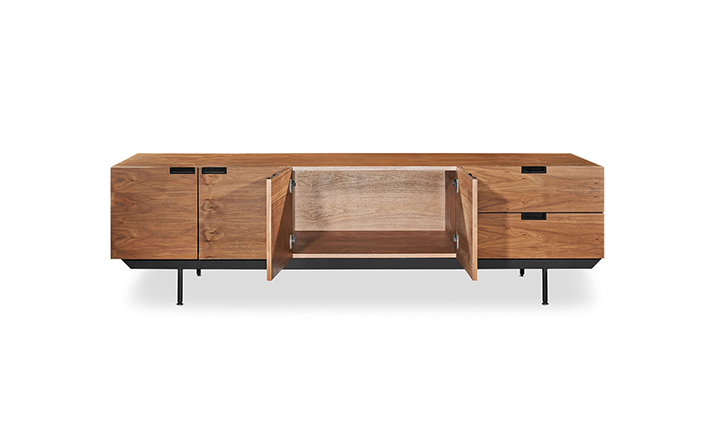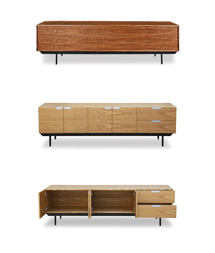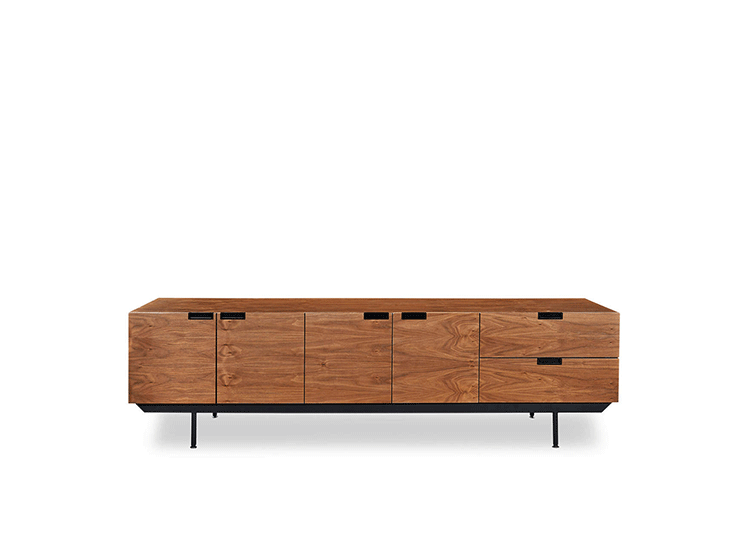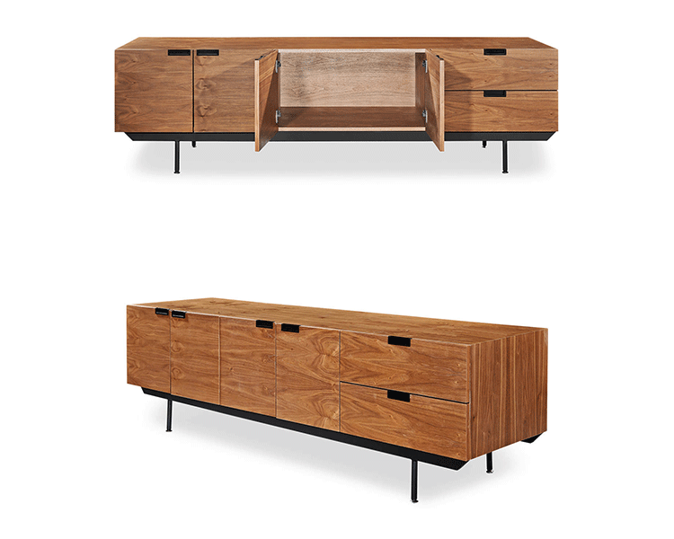 structure mid century modern credenza(结构世纪中期现代书柜)是Kardiel公司制作的经典实木家具。设计灵感来着 Cees Braakman于1958年的原创设计,其有着青铜色的脚架,镶嵌着把手。随着新技术和设计材料的使用,结构以焕然一新的样式出现,框架手工进行了精心雕琢,浑然天成又不失艺术性。制作采用精选MDF板基材胡桃木皮贴面、钢制脚架、环保油漆喷涂、做工精湛。