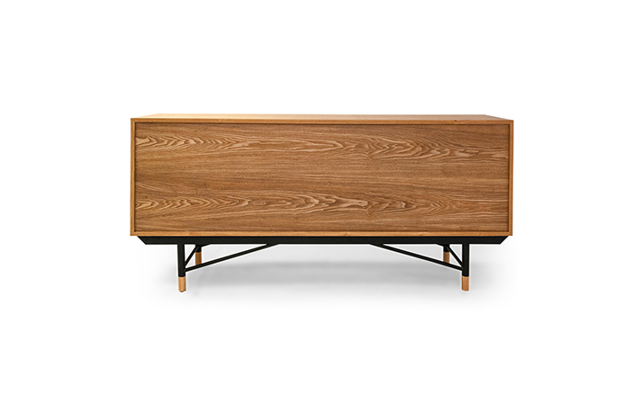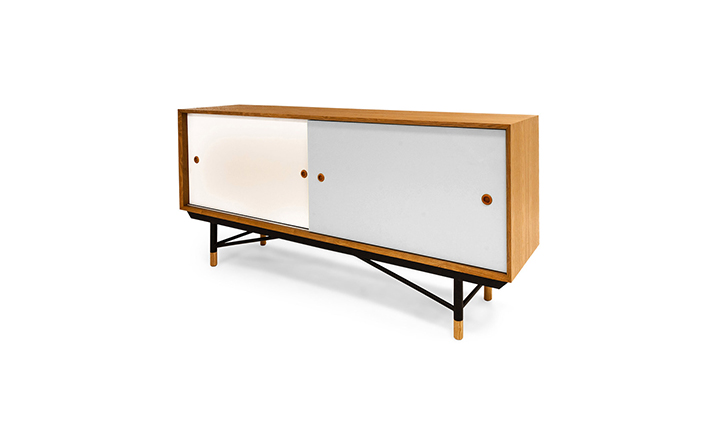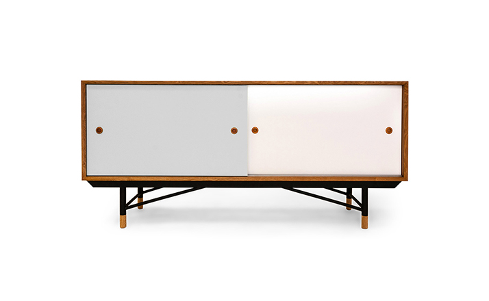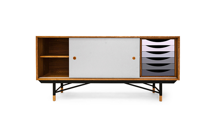 color theory sideboard(色彩理论餐边柜)是设计师Juhl Finn设计的,Kardiel公司制作的经典实木家具,1940年,他设计的第一张座椅、也是最经典的作品——《鹈鹕椅》(Pelican Chair),目前为纽约现代艺术博物馆 MOMA 所珍藏。彩色的滑动门与托盘餐具柜是1955年由Juhl Finn为BOVIRKE设计的。)是Kardiel公司制作的经典实木家具。复古但永不过时的木炭是和橙色,结合美国核桃开创了20中世纪六十年代中现代主义的时代。在现代主义的存储家具上, Finn Juhl和 Arne Vodder 最先尝试胶木和天然木的组合运用。这是大胆的创新,他们结合传统的新鲜的新兴技术与现代主义的概念。他们通过这些色彩绚烂的产品所实现的是令人印象深刻的比例的平衡。制作采用精选MDF板基材胡桃木皮或水曲柳贴面、五金脚架、环保油漆喷涂、做工精湛。颜色元素的使用反映了他迷恋歌德的著名彩色圈,颜色处于和谐的凝聚力。