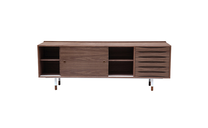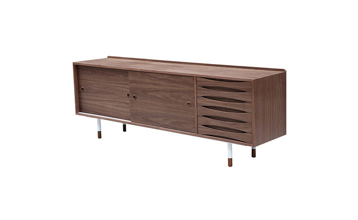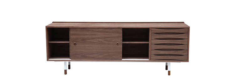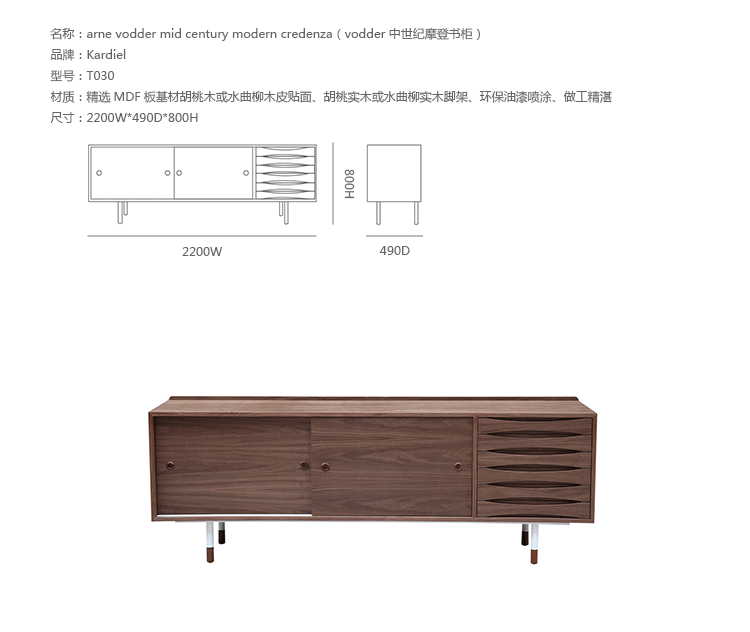 arne vodder mid century modern credenza(arne vodder世纪中期现代书柜)是Kardiel公司制作的经典实木家具,具有世纪中期的现代风格。Arne Vodder书柜拥有三个隔间部分,一个隔间由6个滑动式抽屉组成,其余的两个隔间由2个中等及较低的架子格子组成,能够完成最大化存储。这些抽屉都能够通过金属滑动的滑动门打开或关闭。制作采用精选MDF板基材胡桃木或水曲柳木皮贴面、胡桃实木或水曲柳实木脚架、环保油漆喷涂、做工精湛。