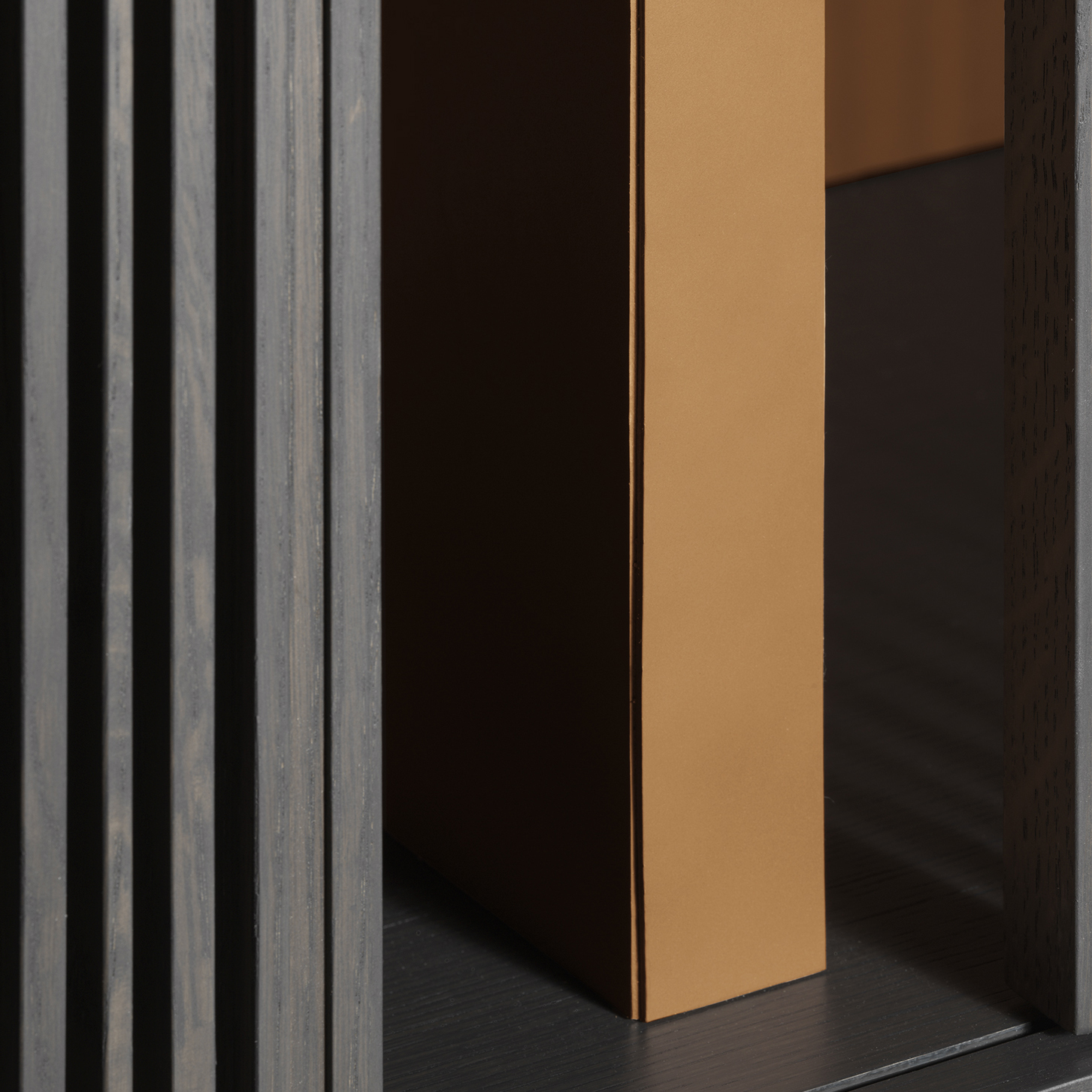 一系列的薄垂直木制棒光网格形式,无形的水平轨道上运行从上到下。 每个网格可以根据需要创建不同的序列。 固体和空洞的分数波动,光与影。 一个好玩的游戏,允许的内容、书籍和对象,没有完全揭示。 最先进的技术结合传统材料,木材和马鞍皮革,形成一个固体和简约的结构。
