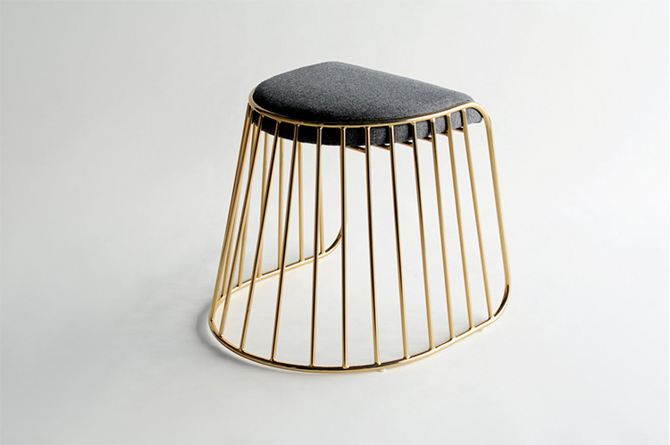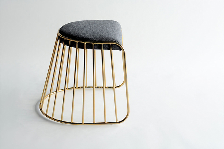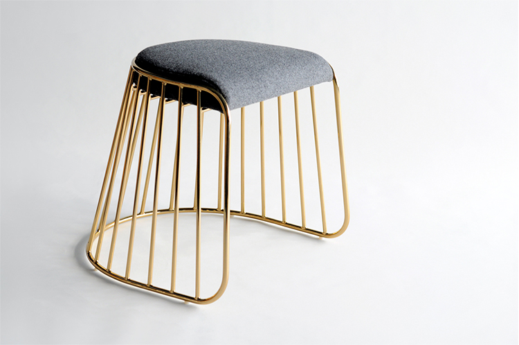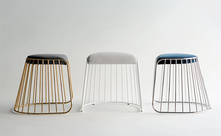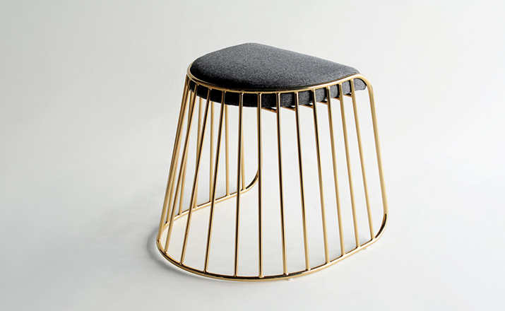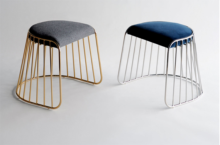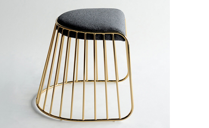 "The Bride's Veil Stool family’s unique language is meant as a graceful alternative to the archetypal stool.The strikingly elegant metal base is available in smoked brass, polished chrome,burnt copper,or powder coat,while the top is offered in COM upholstery.At every angle these stools offer a visual treat."