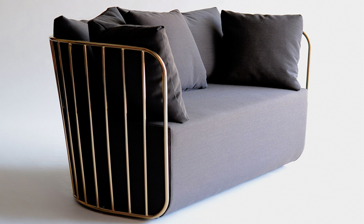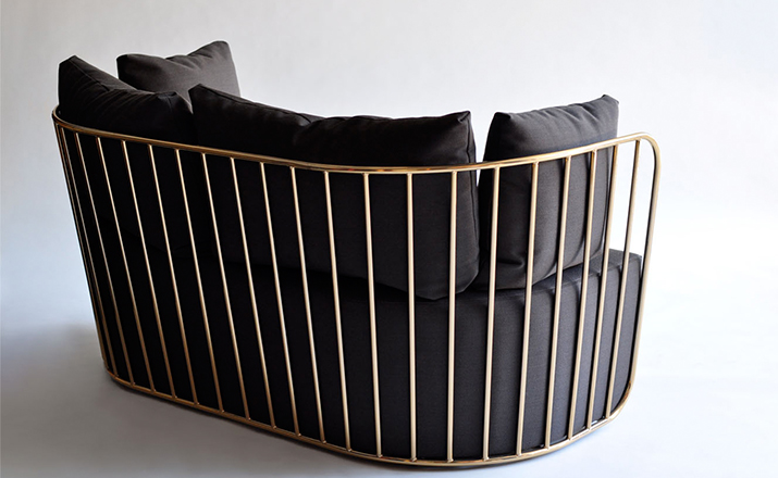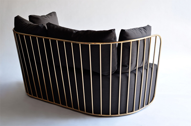 "The Bride's Veil Stool family’s unique language is meant as a graceful alternative to the archetypal bar stool.The double stool is the perfect solution for you and your date to enjoy sitting together uninhibited by separate stools.The strikingly elegant metal base is available in smoked brass,polished chrome,burnt copper,or powder coat,while the top is offered in COM upholstery.At every angle these stools offer a visual treat."