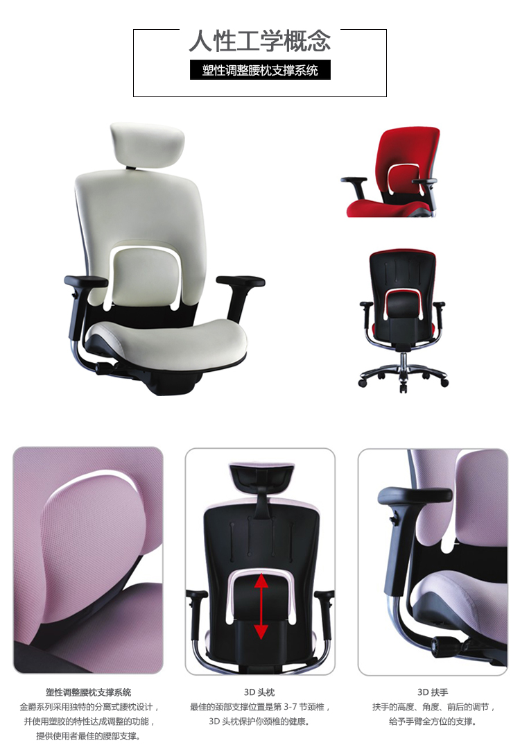 金爵系列采用独特的分离式腰枕设计,并使用塑胶的特性达成调整的功能,提供使用者最佳的腰部支撑;