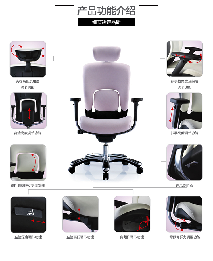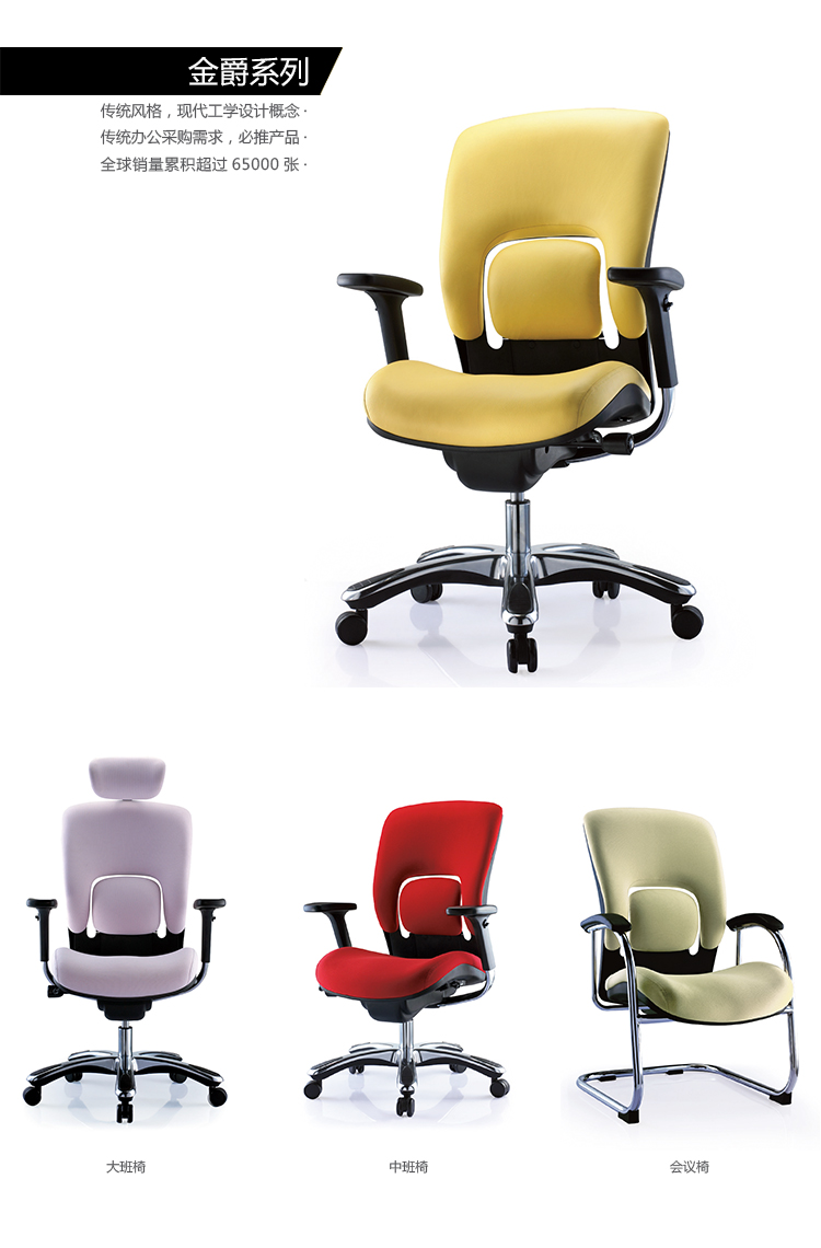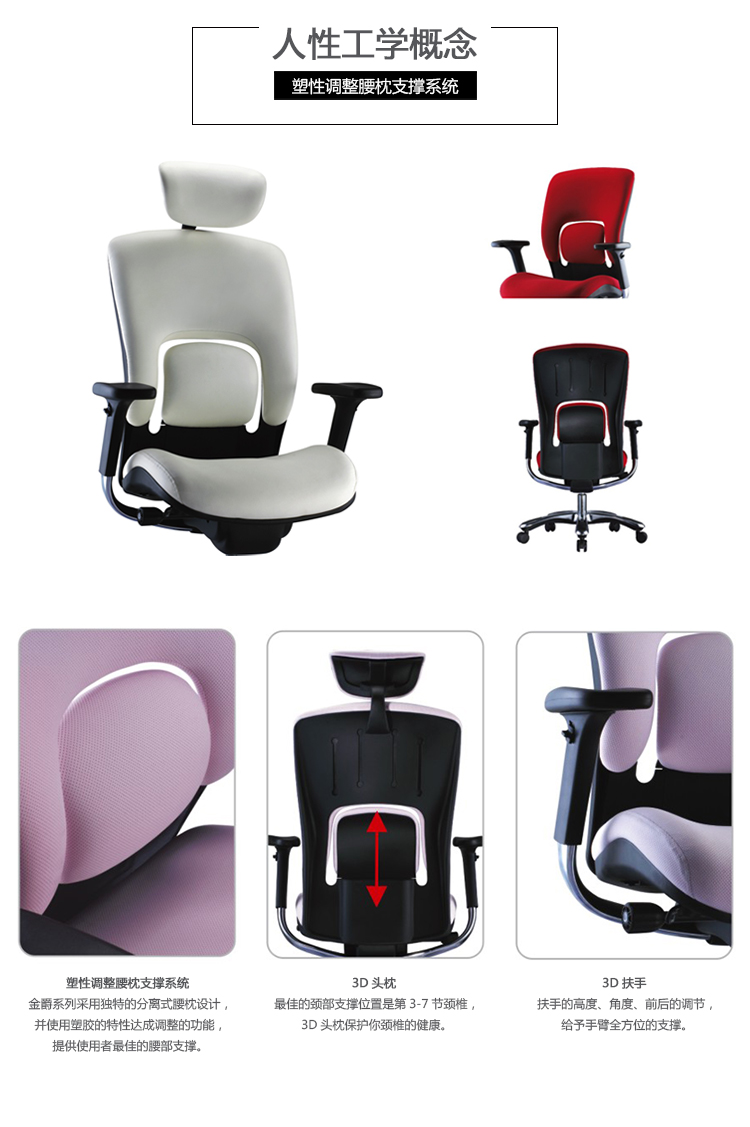 金爵系列采用独特的分离式腰枕设计,并使用塑胶的特性达成调整的功能,提供使用者最佳的腰部支撑