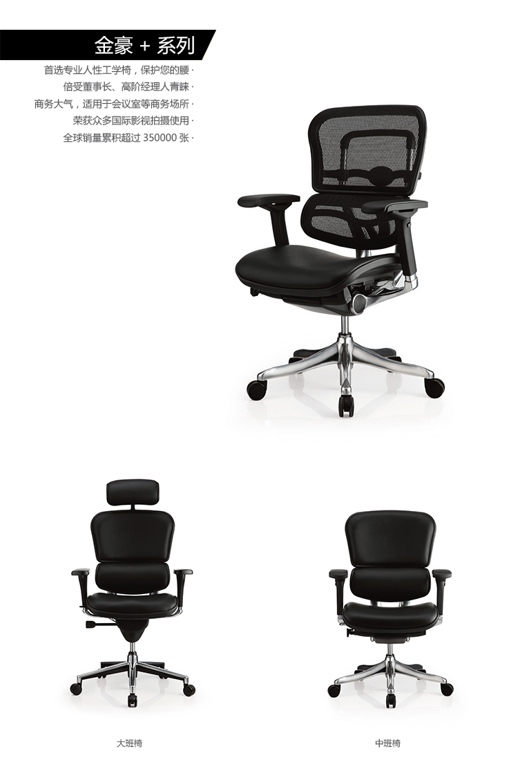 全球首创的单杆式操控底盘,一根杆操控所有功能,使办公椅的操控更加人性化;自动弹性腰枕支撑系统,无论是在坐下时、工作中、或者后仰时,都能让使用者的腰和背获得最舒适的支撑;金豪+系列采用完全性多功能调整设计,从椅背、扶手与座垫可进行全方位的调整;