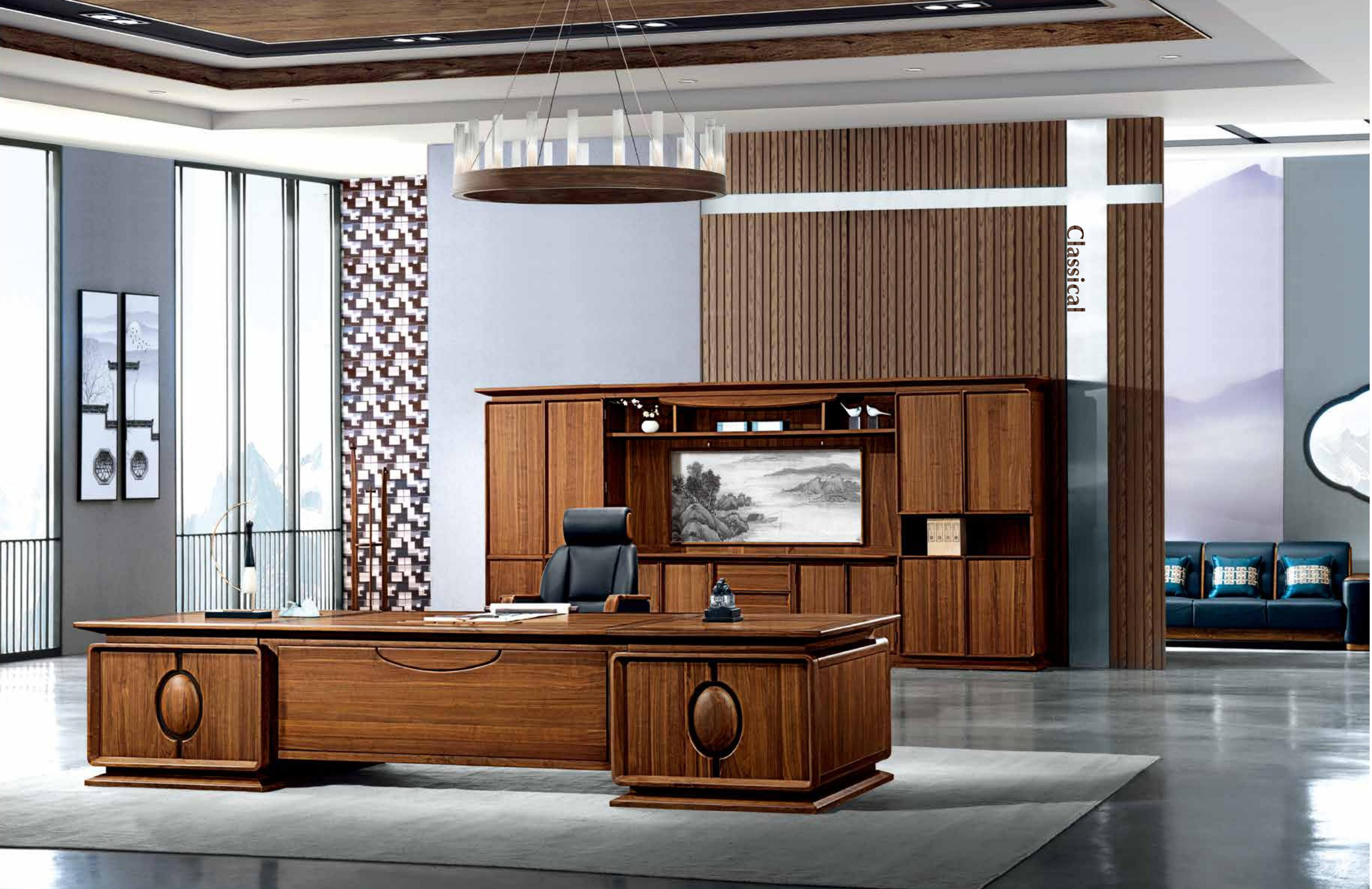 汲取东方文化的深厚底蕴“又融入国际化的简约大气格调,以进口黑胡桃的唯美纹理及卓越质感 深度演绎高级办公家具的独特神韵“冠御一宝石一大班台 融科学的功能设置与境界·形象表征于一体 让最顶级的办公空间雍华尽显“彰显巅峰。 【匠心御木,文化入魂】 艺之道 贵在精贵在纯“但 在这讲求效率“追求速度的工业时代“仿佛整个世界都变得浮躁“而冠御的品牌理念刚好与之相反“我们的工匠大师坚持每一个细节“每一道工艺“都要绝对的专注 用自己的心去感受 用自己的手去苛刻所有的细腻和点滴“在冠御看来“作品就是人品这个时代最需要的 就是这种能够沉住性子“认真做好每一件作品的工匠精神。 【冠御四海,达雅天下】 不甘平凡“向着心中的方向勇敢前行“山重水复却愈见光明 触及巅峰又渴望更高的远峰 此为成功者之境界“亦为冠御办公家具品牌之道“冠御办公家具精选珍材“以名师匠作“缔造办公家具中的世界名作为不甘平凡者提供一方驰骋事业与艺术文化的灵性空间 运筹冠绝四海的雄心“统御旷达天下的才情 在不动声色间品位自显“触目可及处气象万干。 【神韵东方,国际奢华】 东方“以一种神秘与羞涩的形象吸引世人向往“流行也因这种保守而沉潜千年“正因为如此“切因内敛而迷人。冠御办公家具“注重从东方文化中汲取灵感“江南雅居,小桥流水 唐宋诗篇......万般随手可得的东方造型元素与文化印象“在国际化轻奢艺术主义启迪“洗炼下“成为办公家具设计上的闪光点“或隐“或现·不论意象“形态,俯拾皆美。 【儒商达士,韬略文武】 位极人生巅峰 静享成功荣耀 曾经纵横四海的雄心“归结于九尺案前 纸笔 冠达天下的时世大志化作豪椅上傲然一笑“非凡与平凡的和谐“事业与内心的平稳“让巅峰人生更显从容笃实“在偶尔独处的一刻 回归自然的纯净望窗外弯月下涌起江山如画的豪迈“斗室外的心事战场上的风起云涌 谈笑间决胜千里......