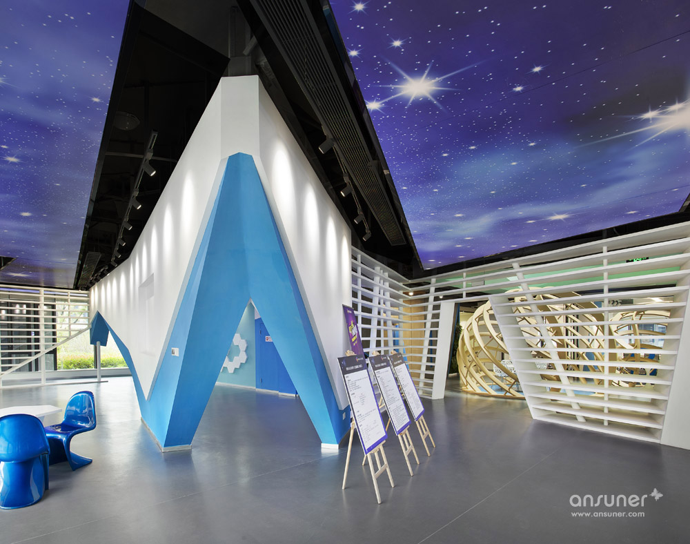 从前台到背景墙及天花的延伸,整个前厅及展厅运用了折纸的造型元素。主色调采用了腾讯的科技蓝,更为体现现代科技质感。展厅通往咖啡厅的休闲区也以折纸的原理打造成既独立又开放的讨论屋,使休闲区更为有趣生动。展厅的天花采用喷绘软膜,展现出星空的神秘质感,也体现出展厅的科技视觉效果。