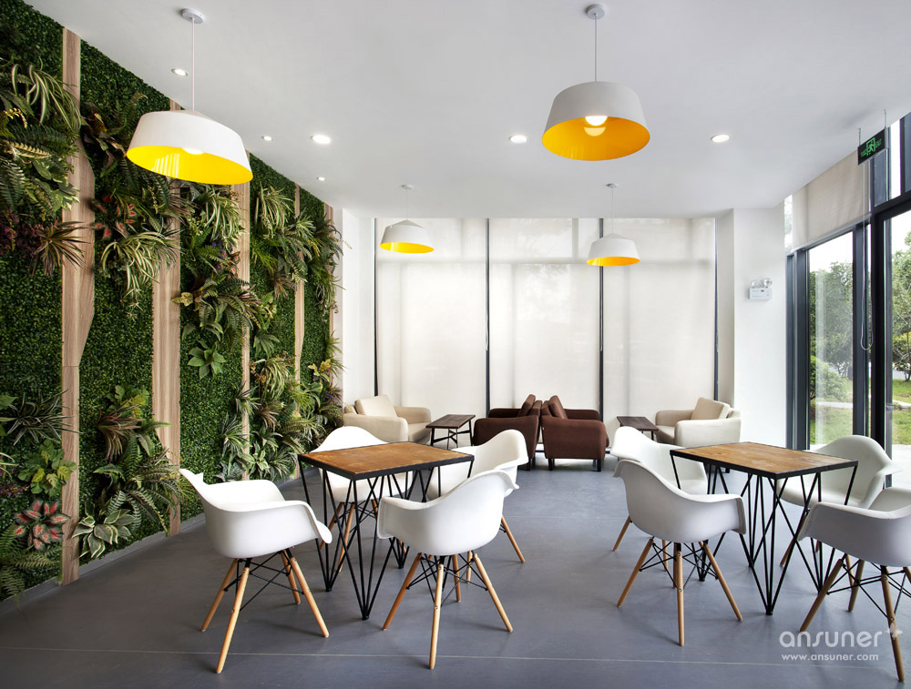 在一楼的沿窗休闲讨论区里,整面墙采用绿植装饰,与室外的绿化相呼应。咖啡厅的效果以简洁为主,地面采用了耐磨及耐清洁的灰色调地坪漆,家具及材料的选择也以暗色调为主,以迎合咖啡的色调。办公区内的茶水区是员工讨论休闲的区域,整个色调的运用营造出温馨放松的空间氛围。
