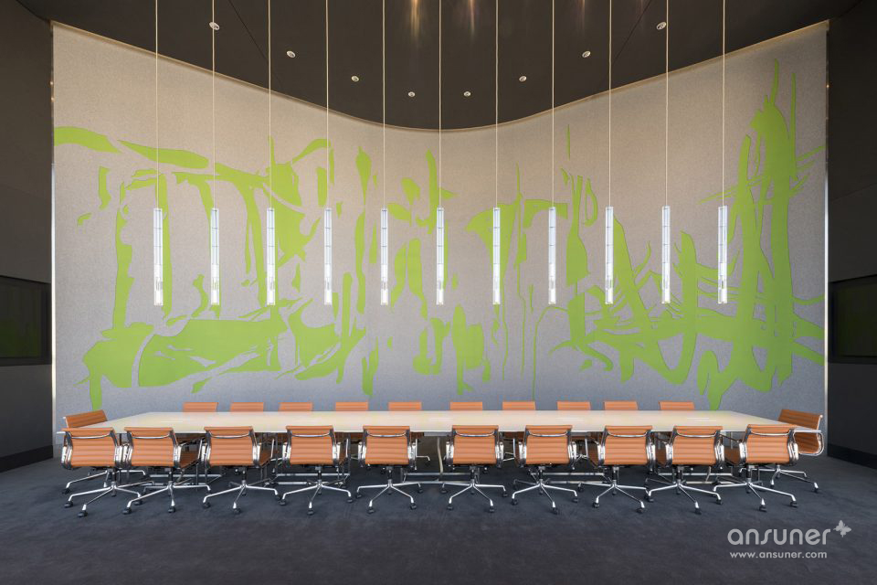 一条螺旋阶梯坡道连接起了建筑的每一层空间,它的外形呈优雅连续的环状,为空间增加了几分戏剧性。坡道采用青铜覆面,被设计成了一个连接和会面的场所。人们可以在这里简短地和同事聊上几句,而不会影响到行走中的人流。