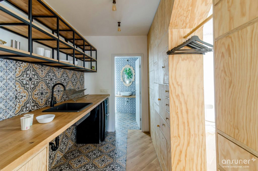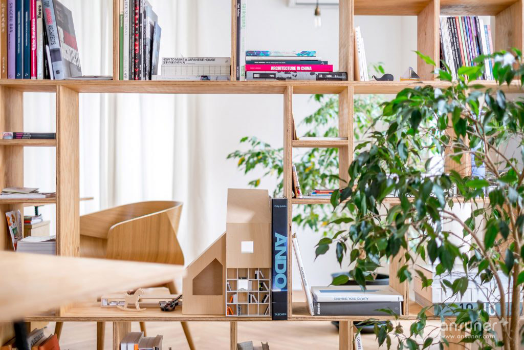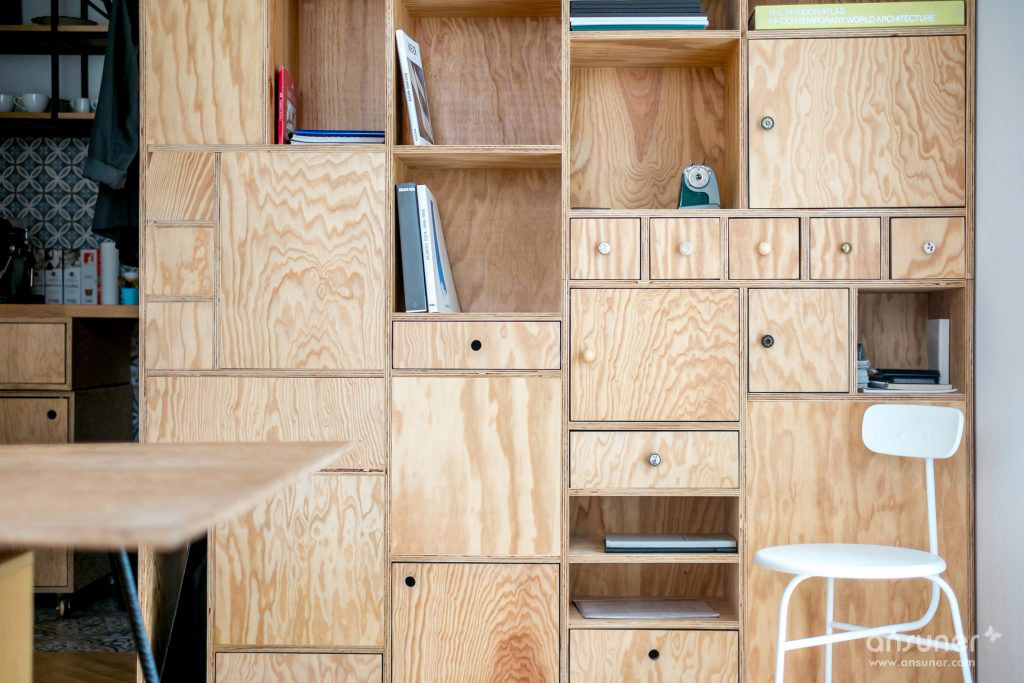 为了实现这一点,他们拆除了前公寓的所有承重墙,将其改造成一个开放式的工作室。然后他们使用胶合板建造新的隔板,整合了货架,立方木,抽屉和橱柜。由于这些特征开口,它们确保不同的区域在视觉上相连。建筑师还添加了半透明的白色棉花窗帘,以便在必要时可以进一步分隔空间。
