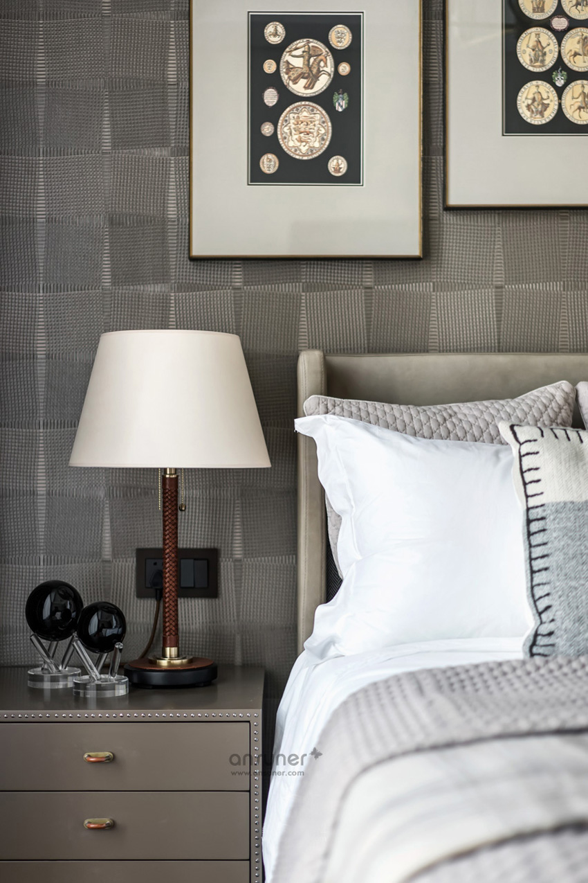 设计师利用对色彩的敏锐视角,以做旧的古罗马灰为主色调表达了主卧空间的优雅和感性,独具风情的格纹地毯,工艺精细的斗柜,艺术装饰画和精心布置的装饰品,让空间有着不同韵律的过渡。