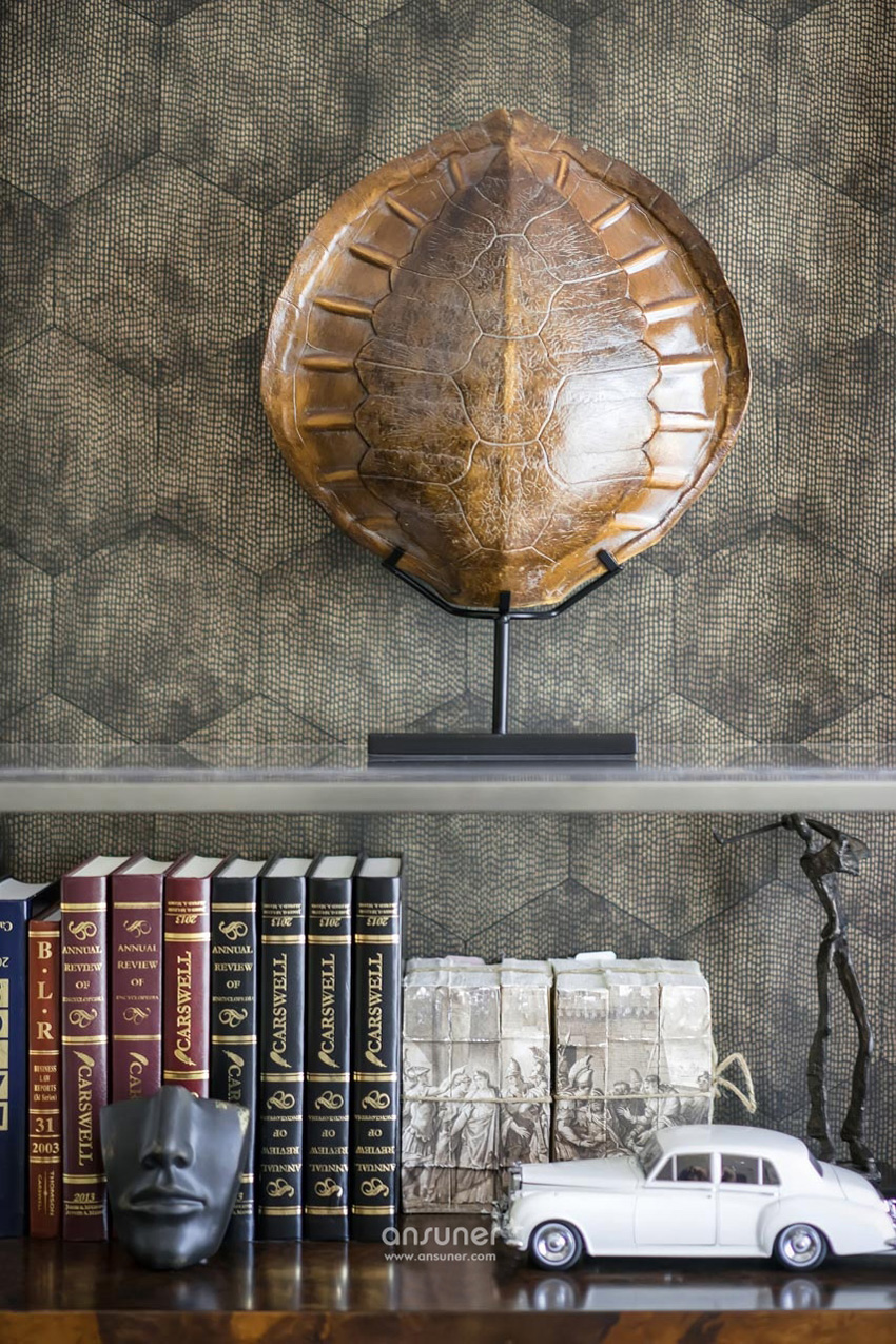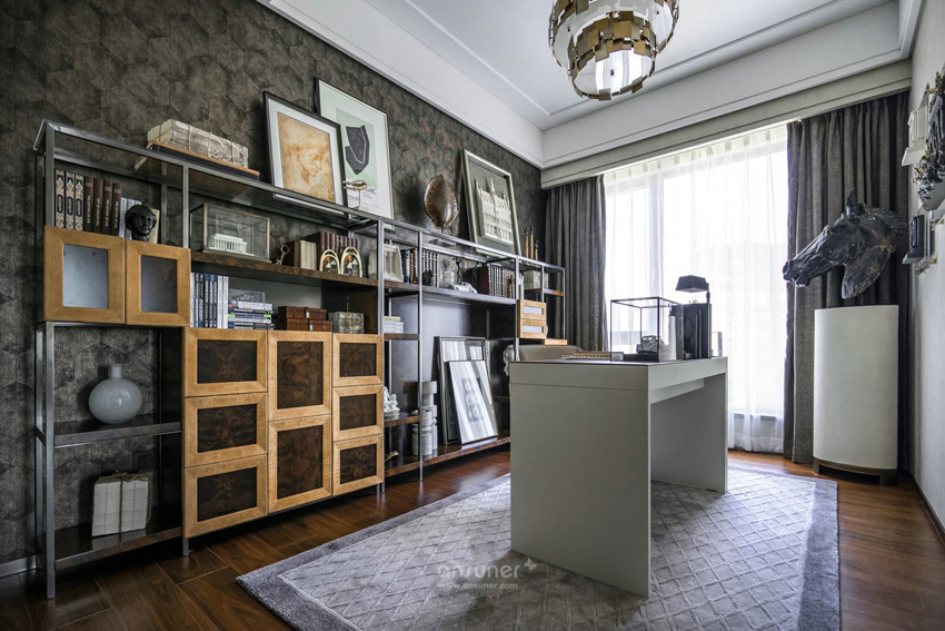 书房以男主人从世界各地带回的艺术品为情景,设计在此,塑造出对居者过往生活的追溯和守望,让这里有故事可讲,有心境可追寻。