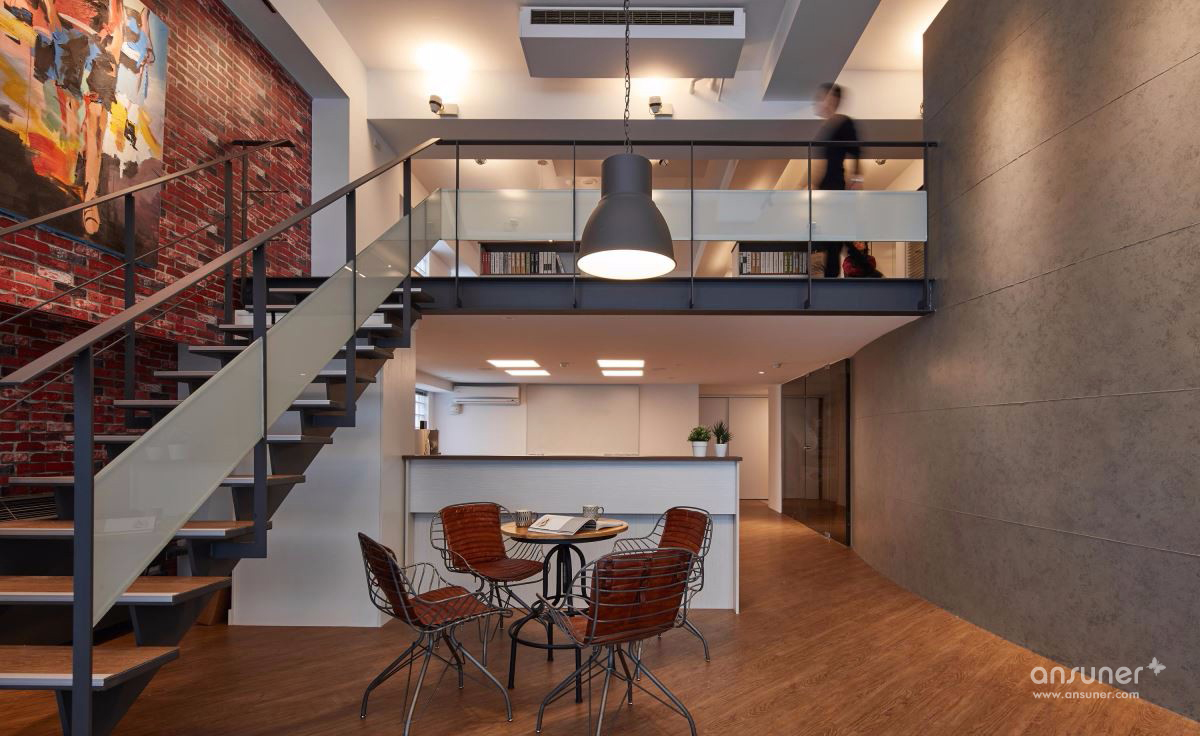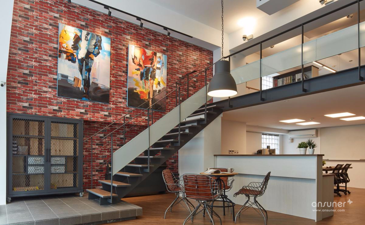 善用挑高空间打造大面积落地窗,并以大量镂空铁件彰显利落气息,设计师更巧妙使用仿红砖壁纸、仿清水模漆以及木纹塑胶地砖,大幅降低装修预算,完成工业风格营造。以一道吧台巧妙分隔接待区与后方会议空间,兼具隐私与置物功用,更利用结构墙下方畸零空间规划柜体,拓增收纳机能。二楼以办公空间为主,以开放设计与纯白色调一扫传统 OA 办公的制式呆版,将有着通风孔设计的无印风置物柜贴齐壁面,让行进动线更加流畅,小型会议室的玻璃隔间更抹除狭小阴暗的可能性。