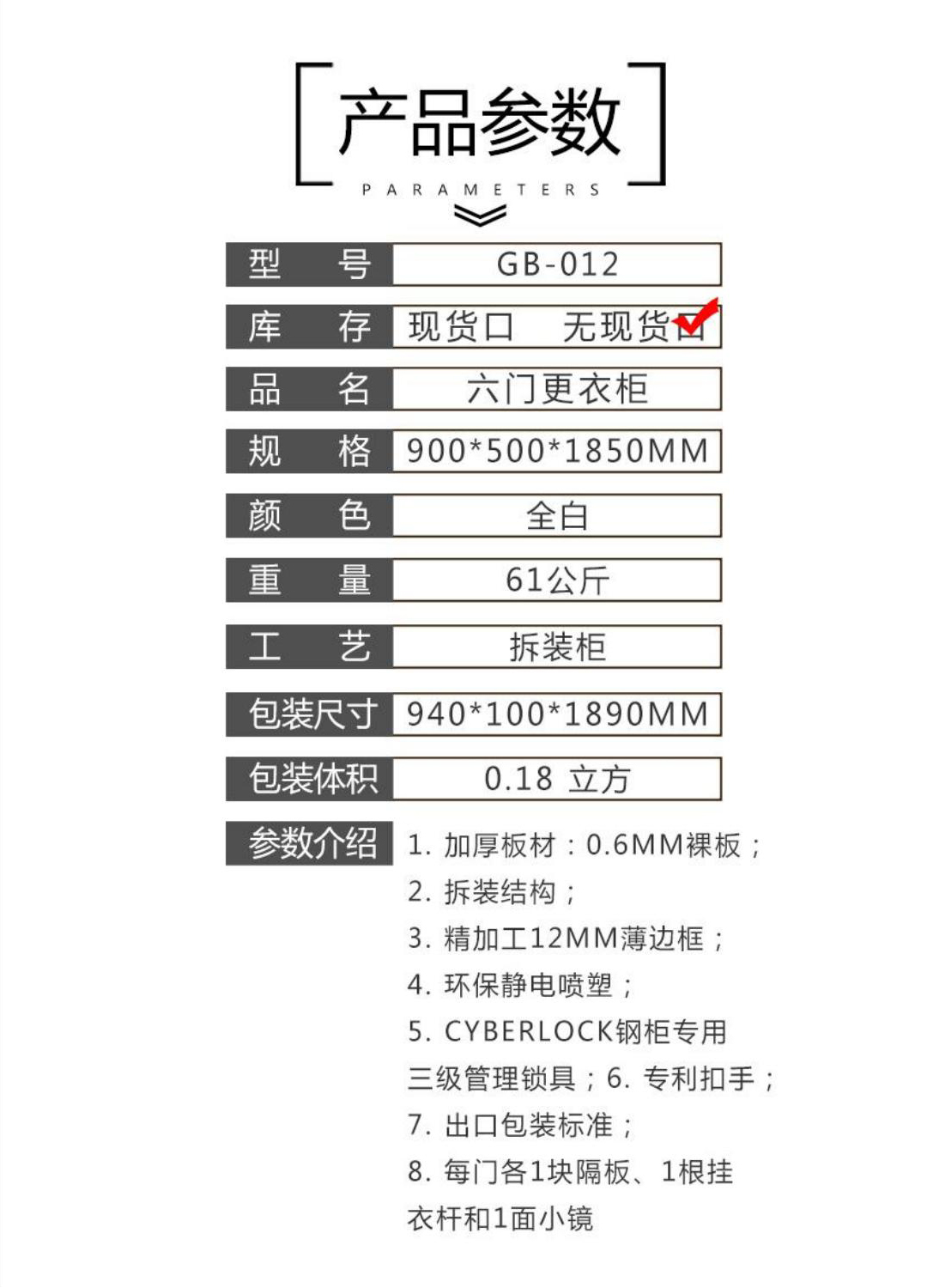 1.加厚板材:0.6MM裸板 2.拆装结构; 3.精加工12MM薄边框; 4.环保静电喷塑: 5.CYBERLOCK钢柜专用三级管理锁具;6.专利扣手; 7.出口包装标准; 8每门各1块隔板、1根挂衣杆和1面小镜。